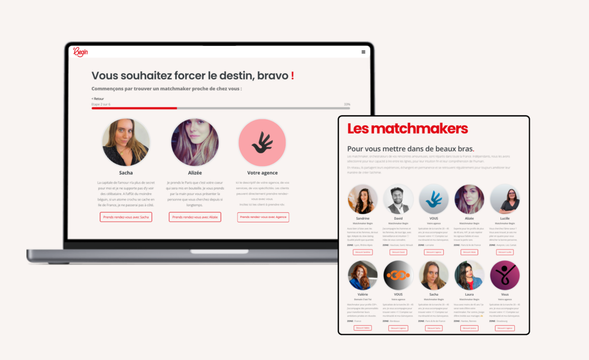 Begin est la première plateforme dédiée aux agences de rencontres et aux matchmakers professionnels. Parce qu’avoir les bons outils permet de faire du matchmaking une alternative crédible et performante face aux sites et applications de rencontres.